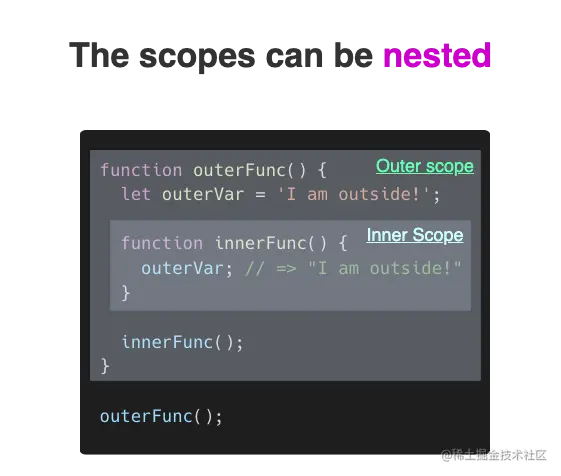 通过代码可知,outerVar能够在内部作用域innerFunc()中可见。