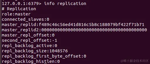 只配置从库,不用配主库:通过info replication来查看信息,当前库的角色是主库,没有从库
