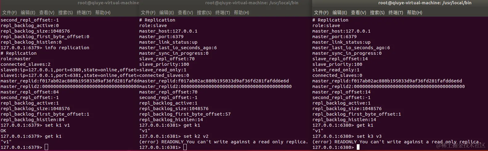 2.主机断开连接了,从机依旧连接到主机,整个集群就只有写操作么有读操作,如果主机回来了,从机依旧可以读取主机写的信息。
