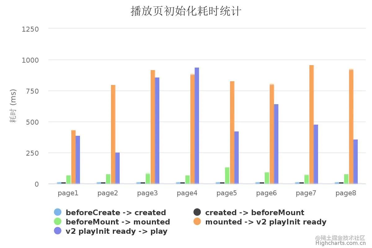 FP 之后就进入了代码执行阶段,下面为 8 个会话按照几个重要节点进行耗时统计的柱状图: