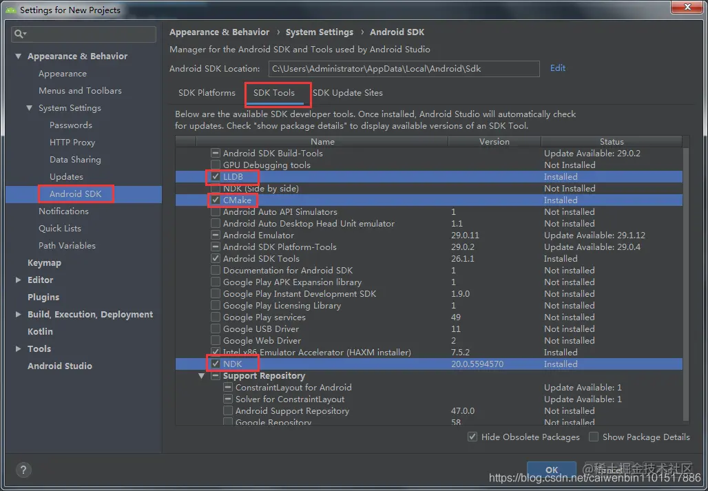 - 打开SDK Manager,添加ndk-build,用于生成so文件。