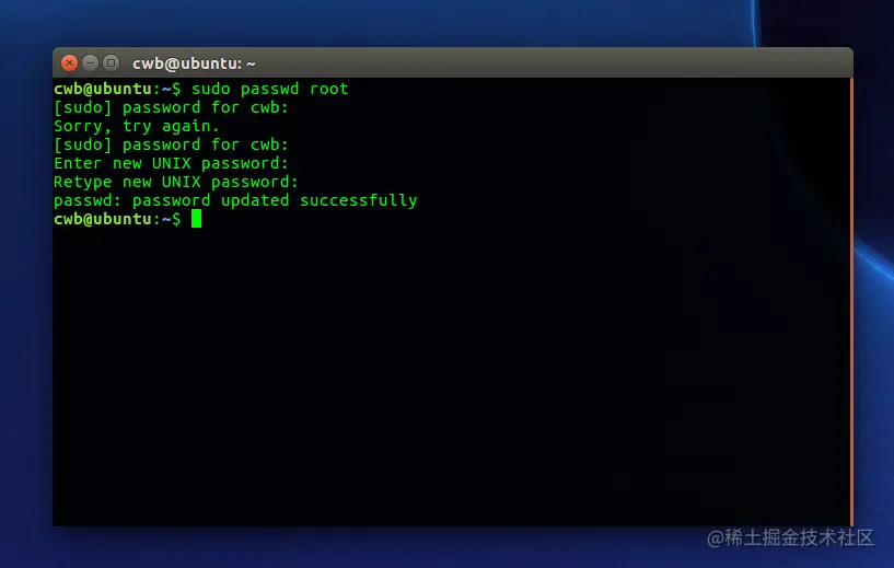 前言:当我们新装好Ubuntu系统后,缺少很多配置项,这时候就需要使用root用户来配置相关环境,但此时默认是不带root用户登录的,也不会出现输入其他用户名密码的登录选项,这时候我们需要初始化root用户信息,并开启登录权限,方可出现其他用户登录选项,通过该选项登录root用户即可进入root用户界面。下面具体步骤为开启root用户的步骤。