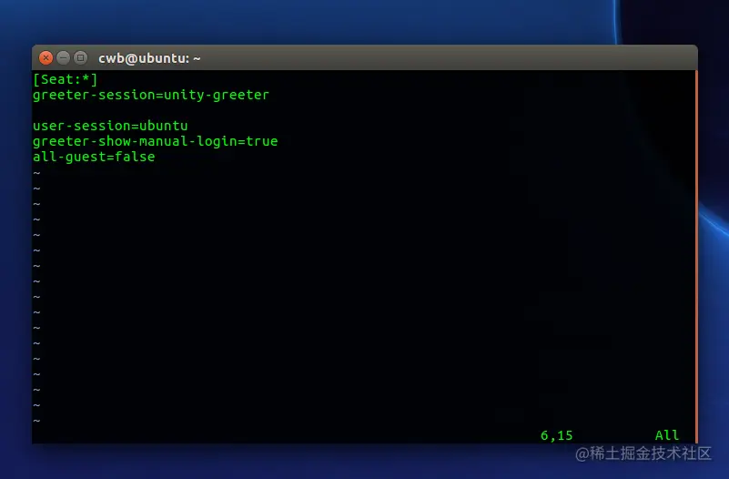 三、使用命令sudo vim /usr/share/lightdm/lightdm.conf.d/50-unity-greeter.conf,打开50-unity-greeter.conf文件