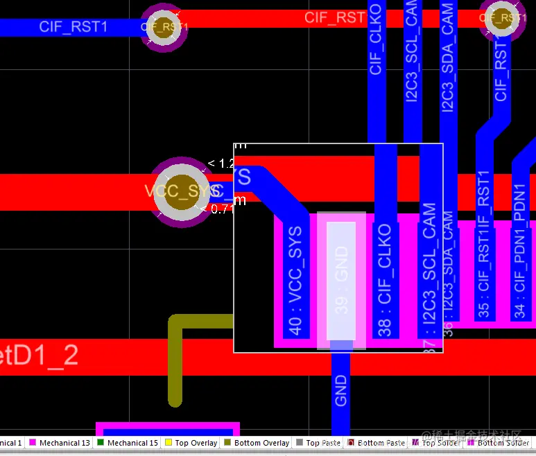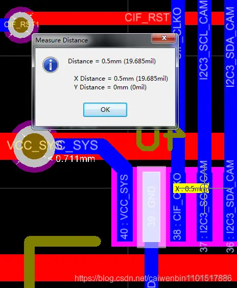- 测量两个PIN间距,Crtl+M是放置测量;Shift+C则可以取消测量。