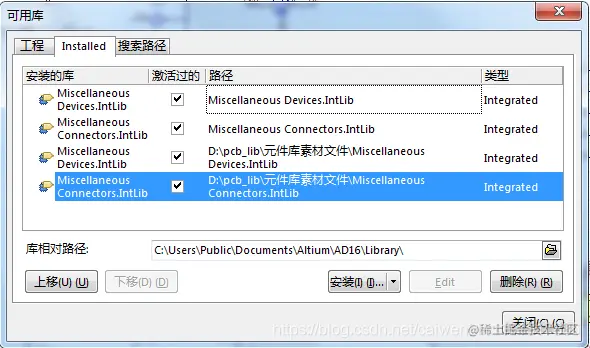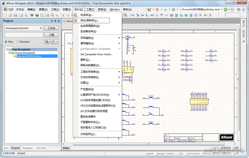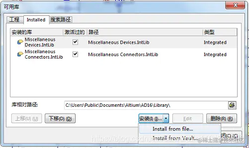 - 加载、卸载元件库,设计--添加/移除库--install from file进行元件库加载,卸载则选中库,删除即可。