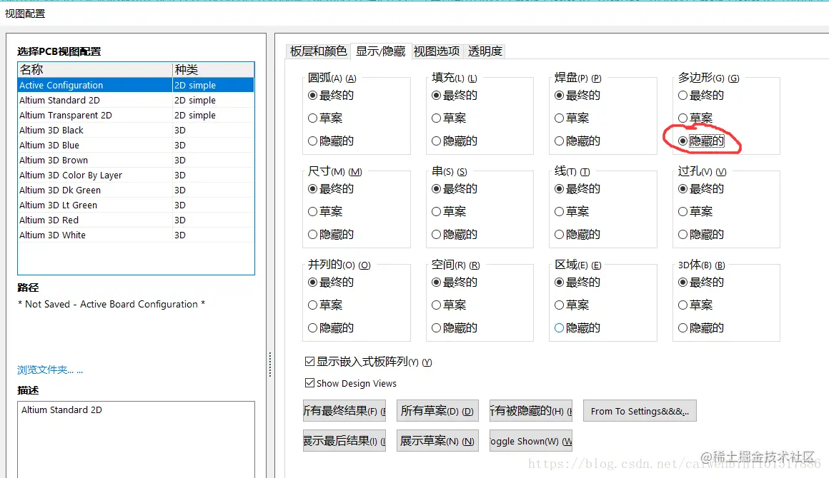 - 隐藏PCB覆铜,ctrl + D,将多边形改为隐藏即可。