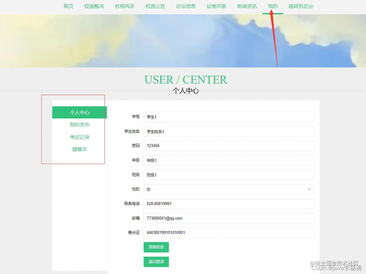 我的个人中心: 可查看修改个人信息、发布论坛、考试记录以及错题本等信息