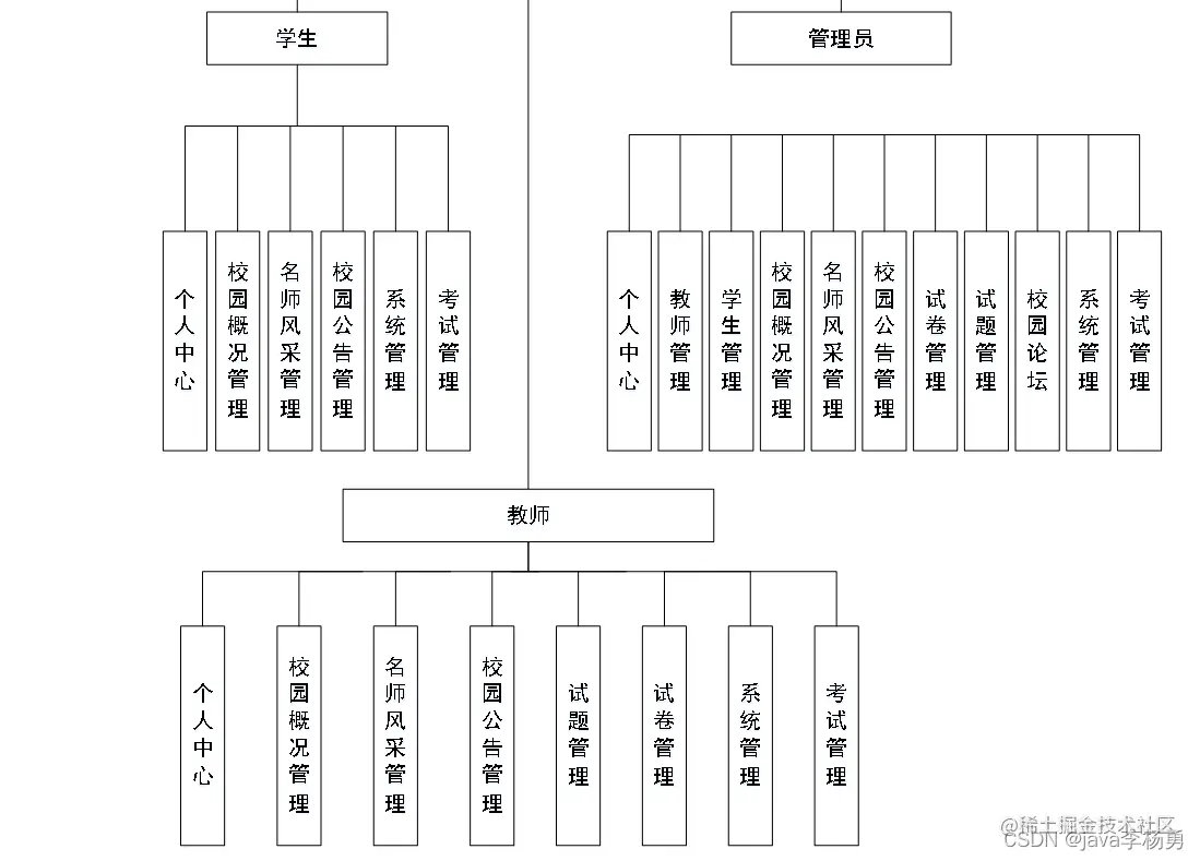 主要功能设计师实现个人中心、教师管理、学生管理、校园概况管理、名师风采管理、校园公告管理、试卷管理、试题管理、校园论坛、系统管理、考试管理的相关信息管理服务。