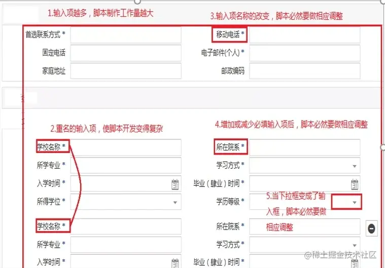 - 页面必填输入项的增减,会使得脚本不得不跟着调整;