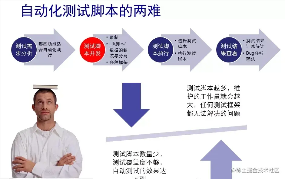 然而无论是哪种工具哪种解决方案,都离不开测试脚本的开发,有过脚本开发经历的人应该有体会,虽然设计良好的自动化测试架构可以简化脚本开发,但是面对成百上千上万的功能,开发和维护脚本始终不是一件容易的事,其复杂度绝不亚于一个开发项目。