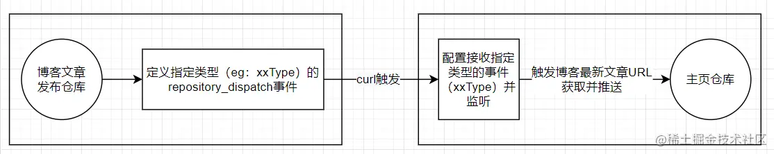 # 文章发布的仓库中定义发布事件触发curl操作发送一个事件类型为[xxType]的repository_dispatch事件