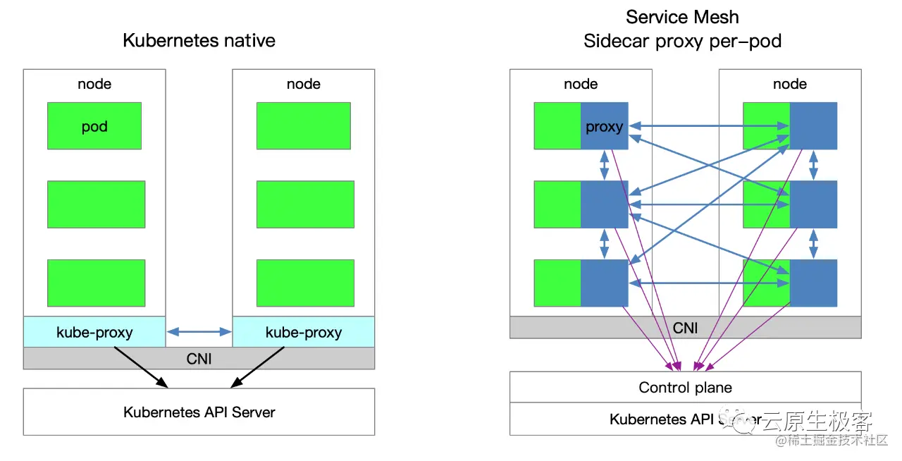 下图展示了 Kubernetes 和 服务网格 (Service Mesh) 的关系。其中Istio会为每一个pod注入Sidecar容器,图中蓝色的Proxy部分。通过统一的控制平面 (Control plane) 对所有的Sidecar进行管理。