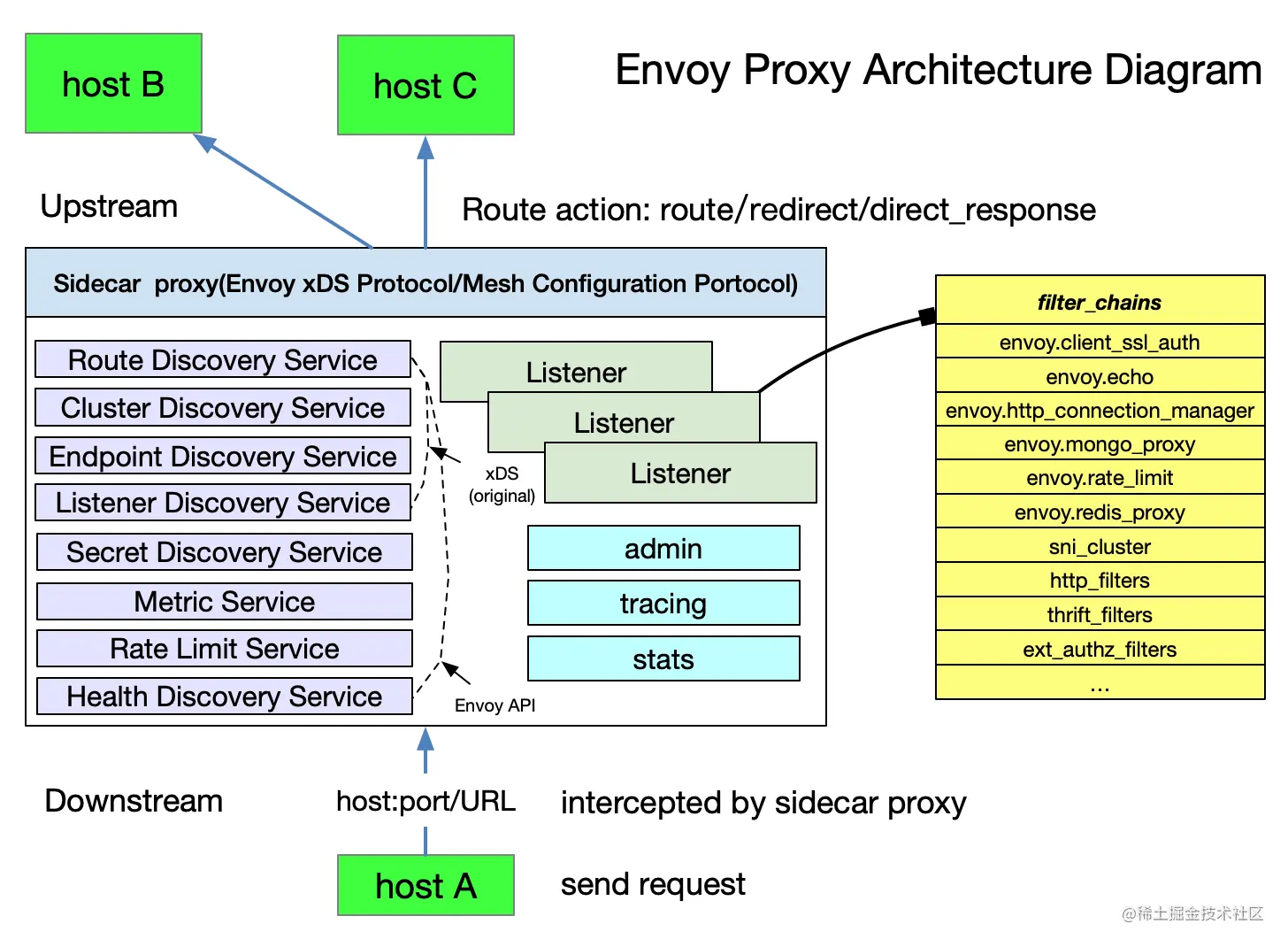 上游 (Upstream) 是以Envoy为连接发起方。上游主机接受Envoy的连接和请求,图中 host A 为上游主机;