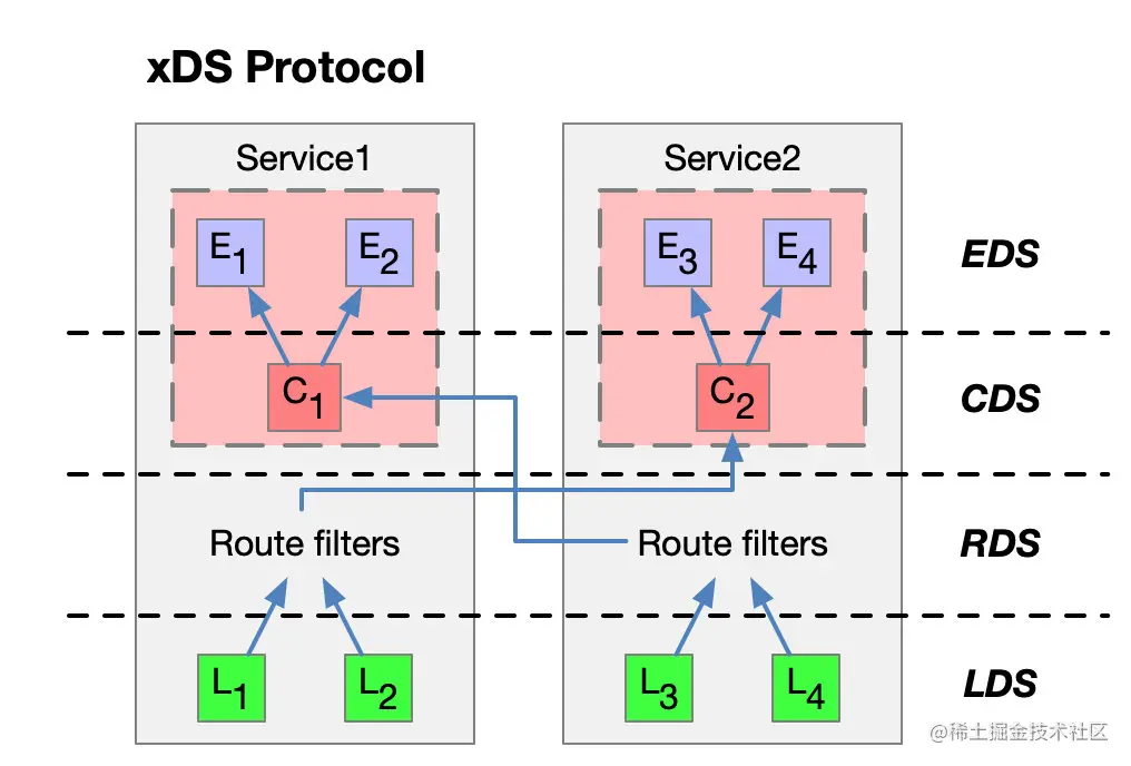 上图中的箭头不是流量进入代理后的路径或路由,也不是实际的顺序。这是一个想象的 xDS 接口处理序列。其实xDS之间是有交叉引用的。