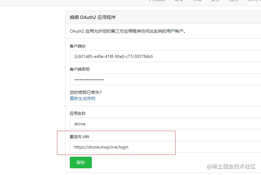 - DRONE_GITEA_CLIENT_ID=2c921d85-e40e-41f8-90e0-c77c383786b5 # gitea 客户端 id