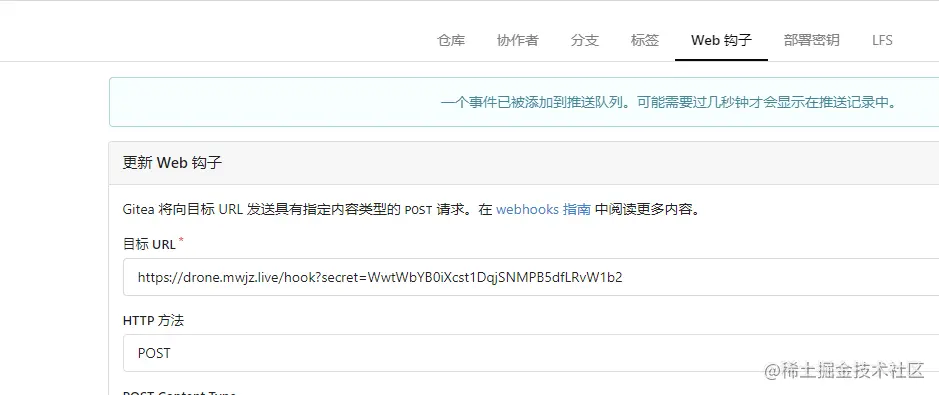 激活后会向 Gitea 注入一个 Webhook。