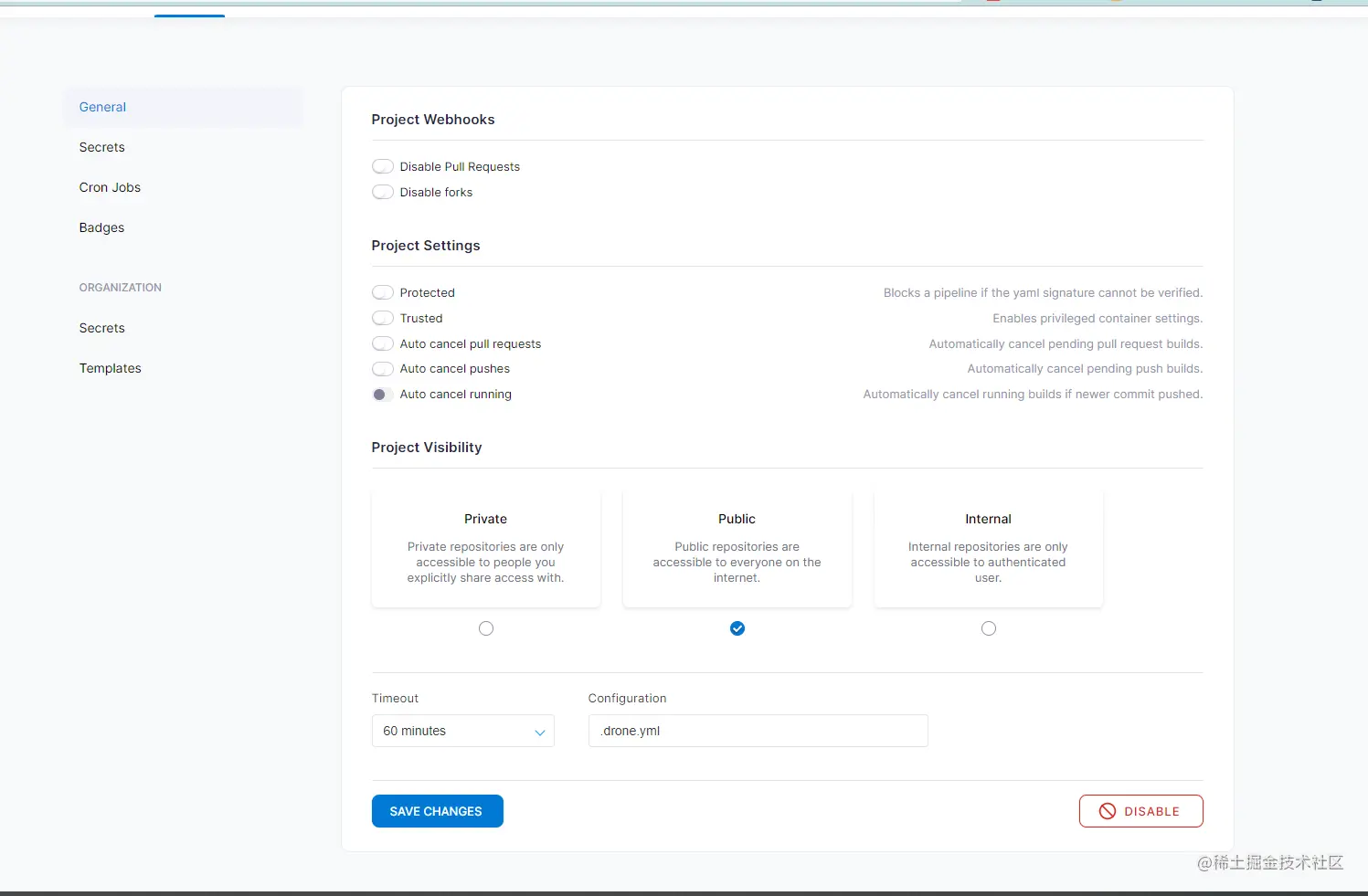 Configuration 是设置配置文件文件,默认为 .drone.yml。 这个一般不需要改动。