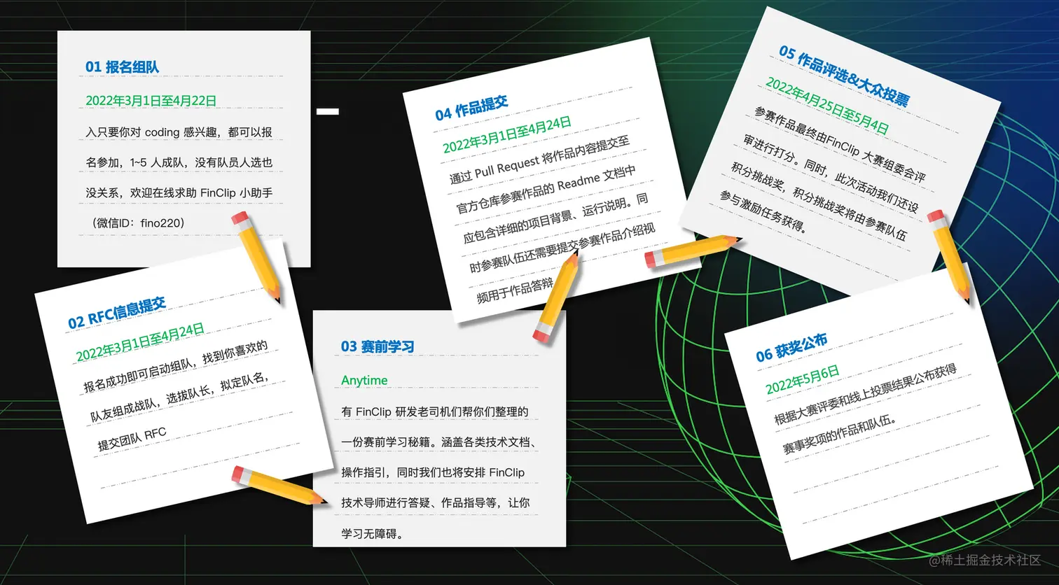 本届赛事将从2022年3月1日正式拉开帷幕,参赛选手可以在报名后提交参赛队伍FRC信息,随后正式进入作品的创建阶段,各队伍需要在几周的时间内自行完成作品的开发和提交。赛事评委将从4月25日起开始对所有作品进行评分,评选优秀的获奖作品。