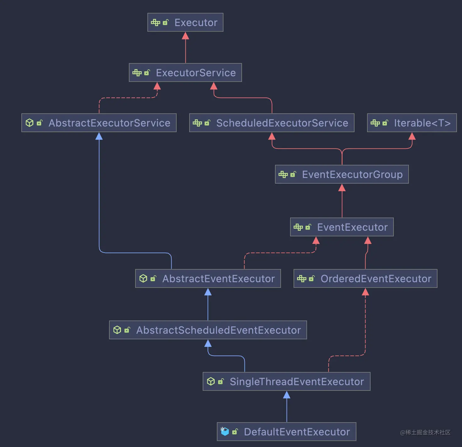 同时EventExecutorGroup还继承了Iterable接口,表示EventExecutorGroup是可遍历的,它的遍历对象是EventExecutor。