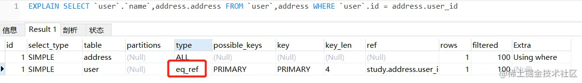 EXPLAIN SELECT user.name,address.address FROM user,address WHERE user.id = address.user_id ; - 可以看到