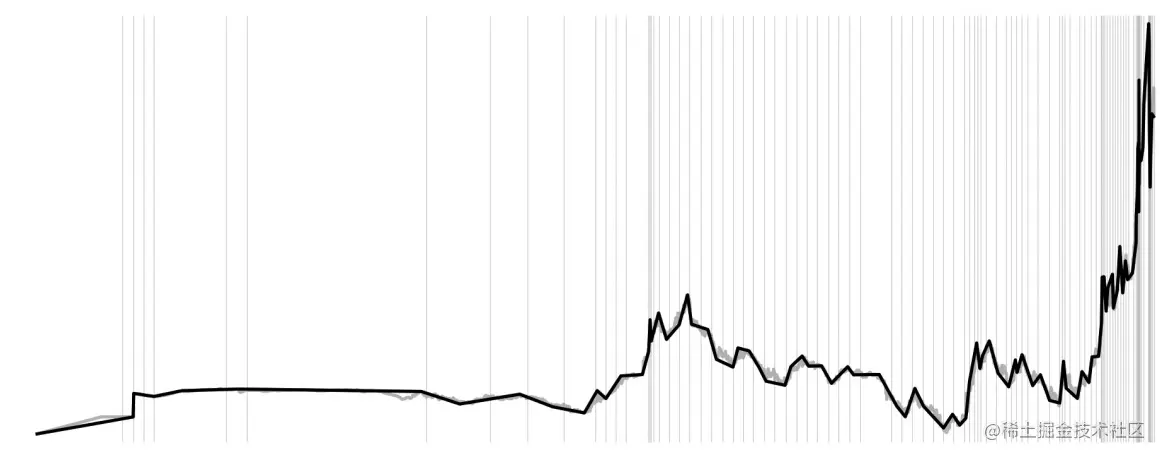 同样,进一步的,我们将分桶的过程也纳入优化的范围,因为在一个图上,视觉重心不一定的平均分布的,例如我们这个图,与其对他进行平均分桶,根据数据变化的量来进行分桶显得更加合理,这里就引入了动态规划,「动态最大三角算法」(Largest-Triangle-Dynamic)。
