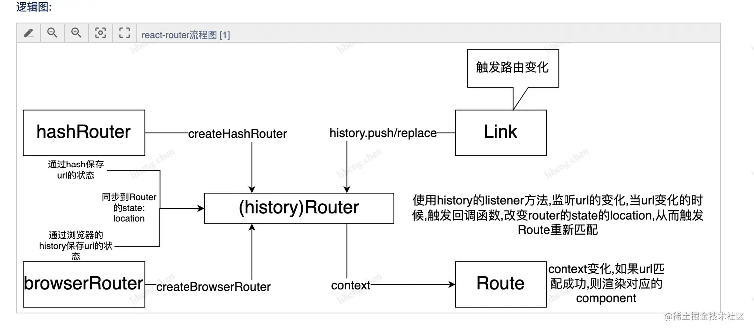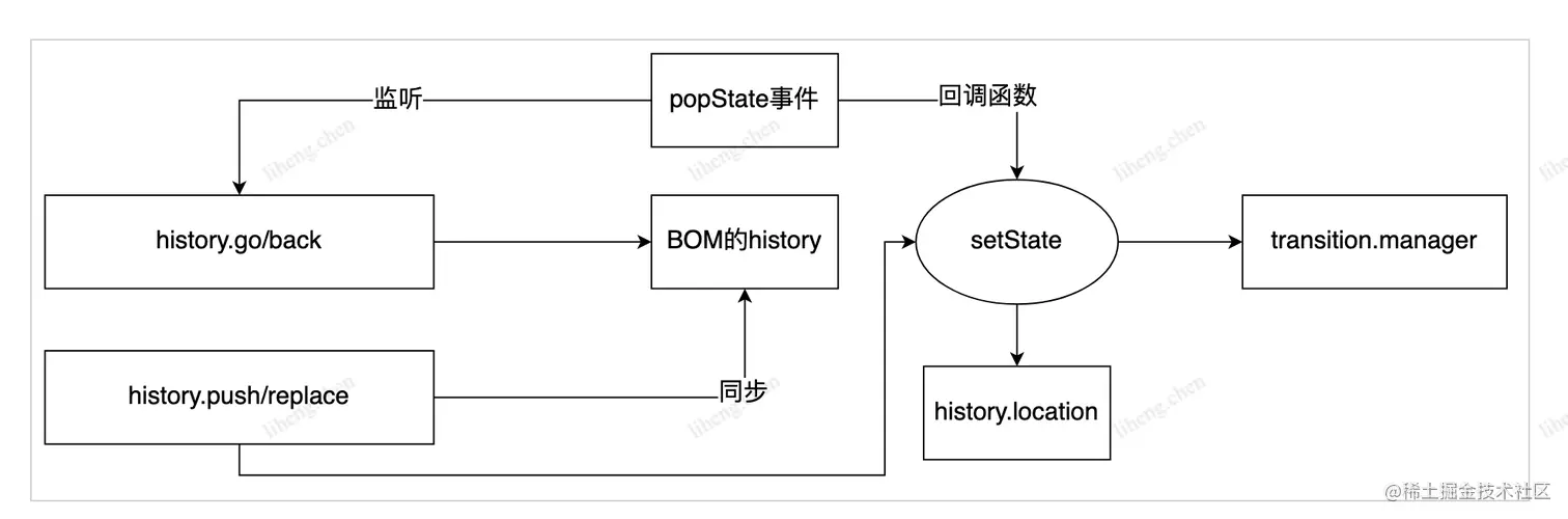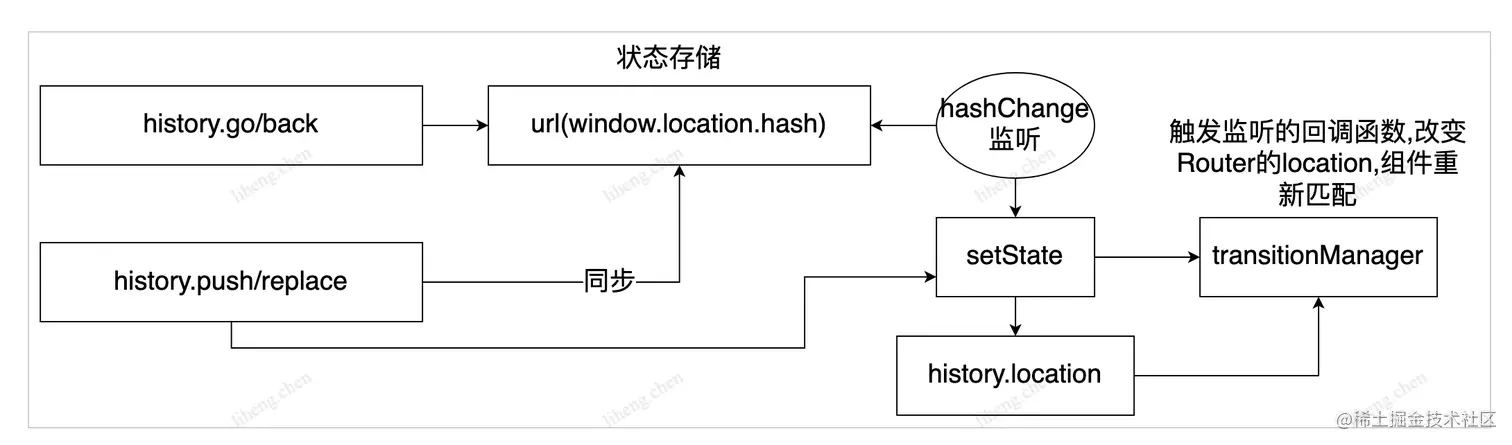 - 借助history库,history中实现了push, go, goBack等方法,注册了hashChange事件,当路由跳转时,使用浏览器内置的history api操作history栈 改变