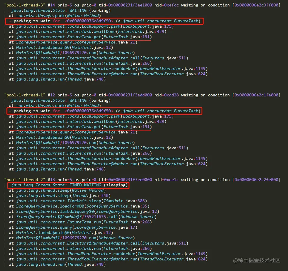 一个线程在 sleep,另外两个线程执行到了 FutureTask 的 get 方法。