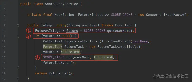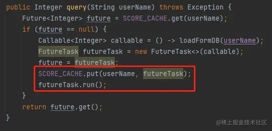 FutureTask<Integer> integerFuture = (FutureTask) SCORE_CACHE.computeIfAbsent(userName, key -> futureTask);