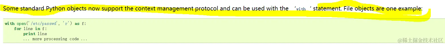 上面那么为什么with可以实现这么强大的功能呢,即替代了try...finally,不用捕捉异常了,也不用手动调用close了,要想弄明白这个问题,先了解下python中的上下文管理器(Context Manager)。