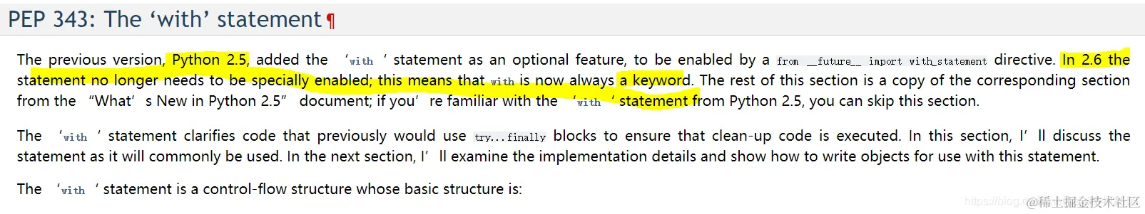 Python 还提供了一个 contextmanager 的装饰器,更进一步简化了上下文管理器的实现方式。通过 yield 将函数分割成两部分,yield 之前的语句在 __enter__ 方法中执行,yield 之后的语句在 __exit__ 方法中执行。紧跟在 yield 后面的值是函数的返回值。具体详细参考python官网:docs.python.org/release/2.6…