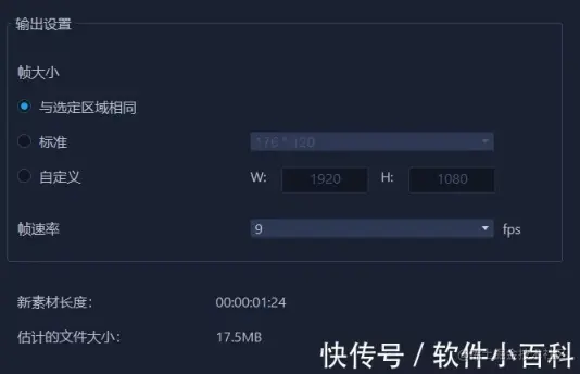 4.在下方的功能区中,主要是对输出进行的设置。你可以在此功能区中进行帧率的大小调整,改变视频每帧播放的速率。在下方你也可以看到预计输出的图片文件的大小。