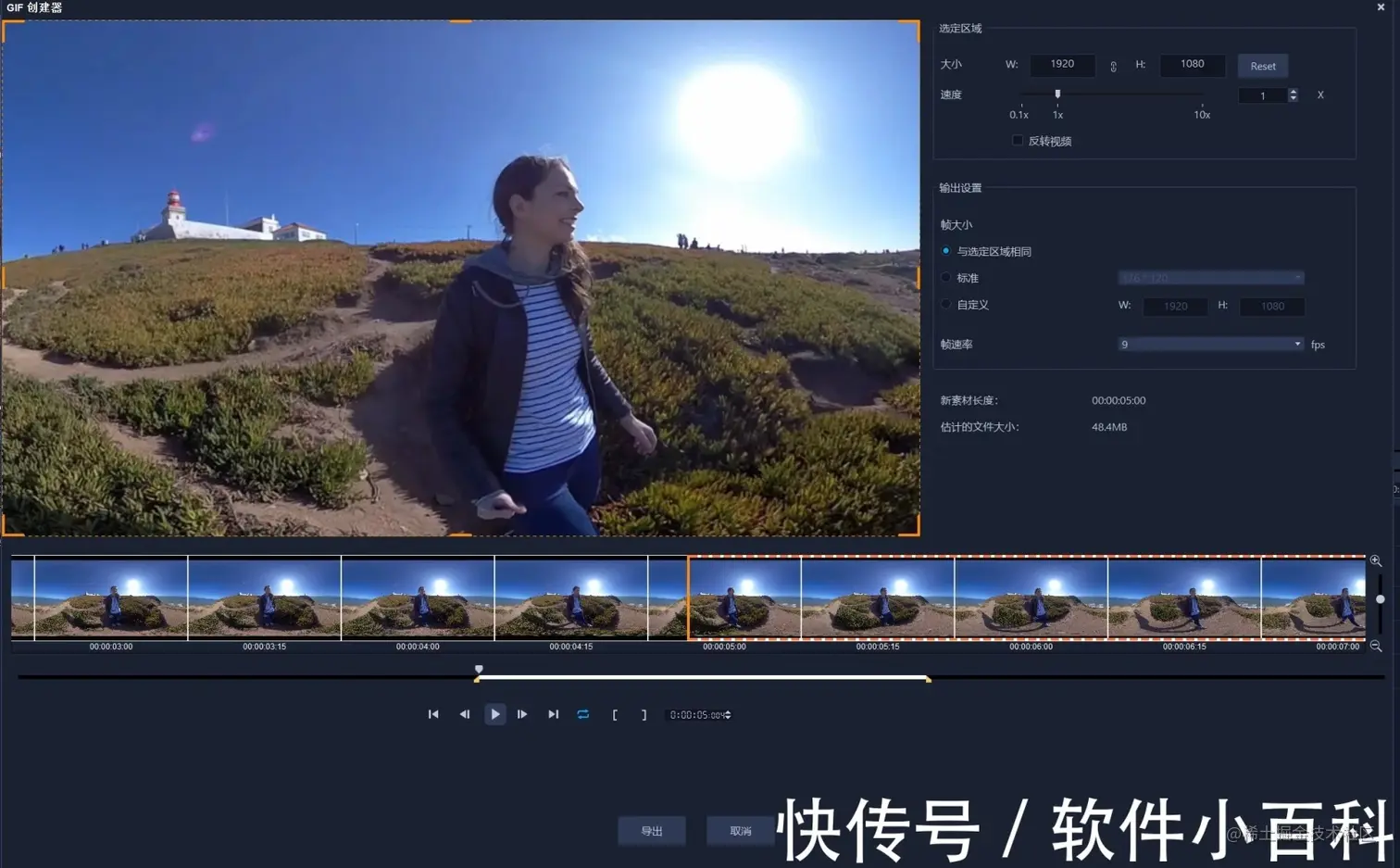 2.新版本的 GIF 创建器面板如下。首先,你需要在下方的时间缩略图中,自由截取需要的视频部分。