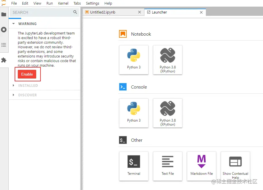 - 进入 jupyterlab, enable Warning 中的内容即可使用扩展