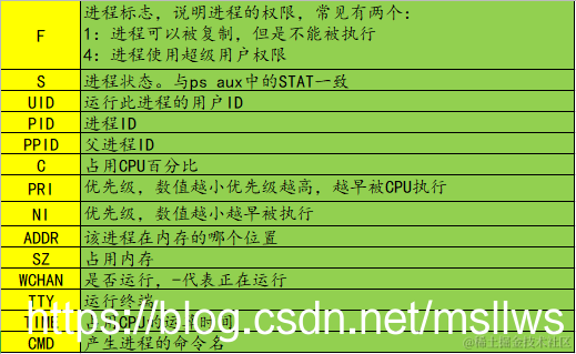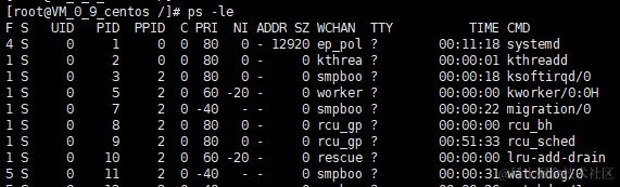 - ps -le 命令:也可查看系统中所有的进程,而且还能看到进程的父进程的PID和进程优先级: