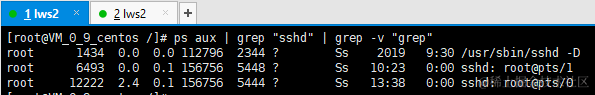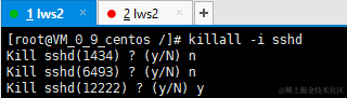 如下查看登录系统的sshd进程有3个,第一个为sshd服务进程不能杀死,下面两个为远程终端,此时我们可以用 killall -i 命令杀死第二个终端,杀死后终端掉线: