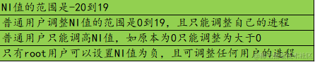 可通过修改ps -le命令结果中的“NI”值(Nice)来调整进程的优先级,NI值越小,PRI值就会降的越低,该进程就越优先被CPU处理。关于NI设置的注意事项: