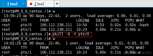如下使用 w 命令 查询当前有两个登录用户,可使用 pkill -9 -t 用户终端号 强制踢出其中一个用户: