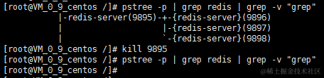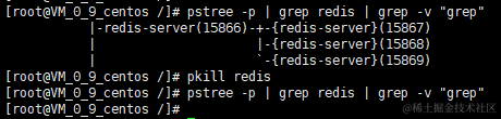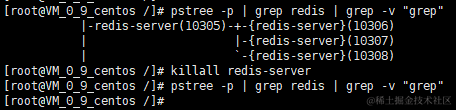 - 可通过 killall 进程名 命令杀死一类进程,如下又杀死redis进程: