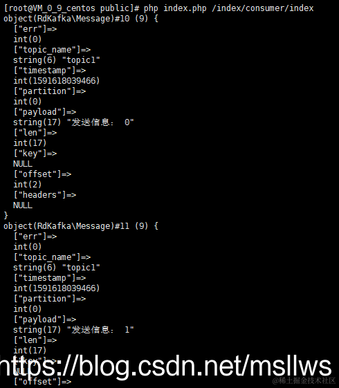 3)执行消费者监听消息:php index.php /index/consumer/index,然后执行生产者:php index.php /index/producer/index,可见消费者收到了消息:(tp5)