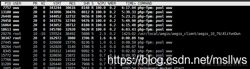 果然看到有多个php-fmp进程占用cpu过高,都达到100%了