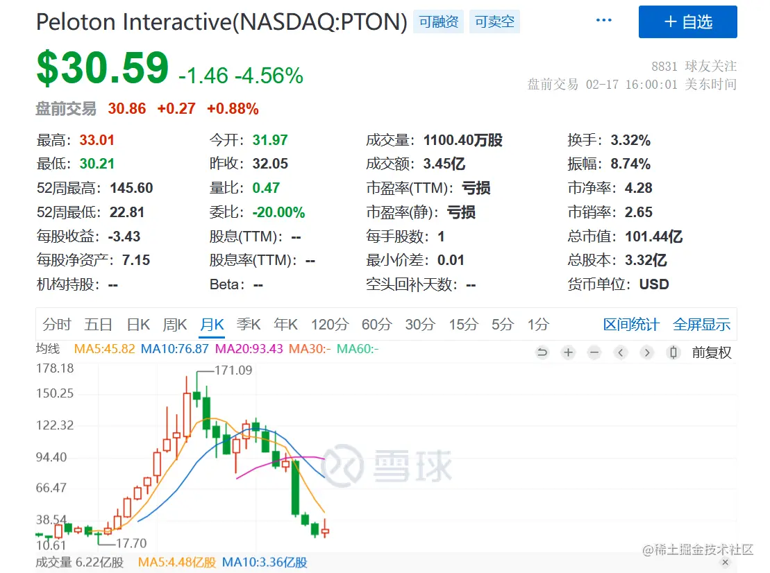不过,从2021年开始,可以看到Peloton股价迅速回落,到了今年更是跌到谷底,相比最高峰已经缩水80%。