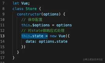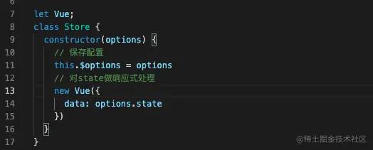 这个options是不是会接收一些选项啊,我们来思考一下会接收哪些选项? new Vuex.store()这个实例接收的对象对不。这个选项里面对我们最重要的是不是就是state啊!所以到这大家应该怎么做?是不是要把options这个选项里的state拿出来做响应式处理啊
