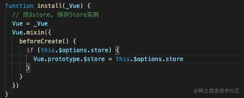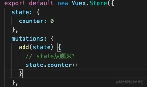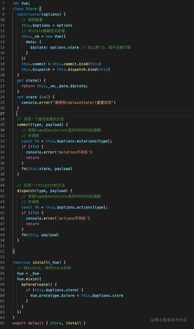 $$state里。划重点了!!!$$state这样做有一个好处,这样就不会被代理了。后面及时用户取到了_vm,他也不会看到$$state - 定义个get 方法,这样以后用户通过store在访问state属性,我们应该把_vm里的