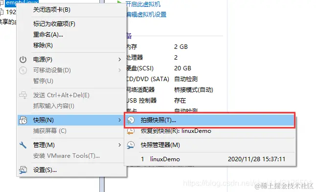 一,打开VMware,对需要被克隆的系统进行拍摄快照(作为镜像,方便一会多次克隆)