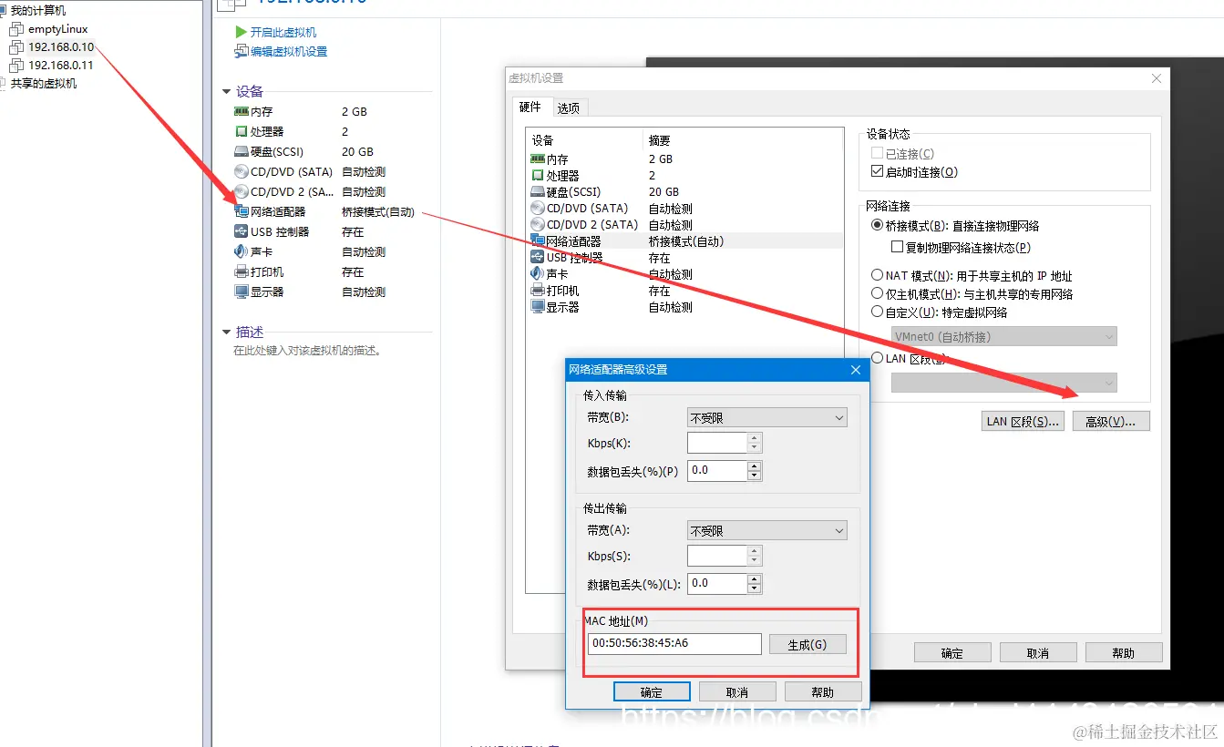 四、对已克隆的虚拟机改变物理网卡地址,多点击几下“生成”(复制物理网卡地址放到一个txt文件,待会要用),点击确定