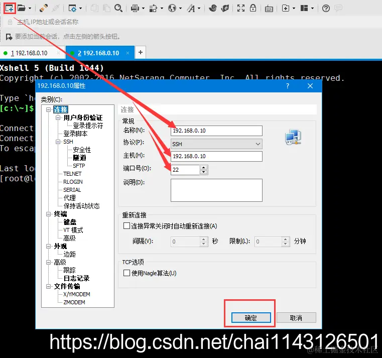 我使用的是Xshell工具,输入IP地址,22(TCP加密)端口,后面再输入用户名,密码,登录