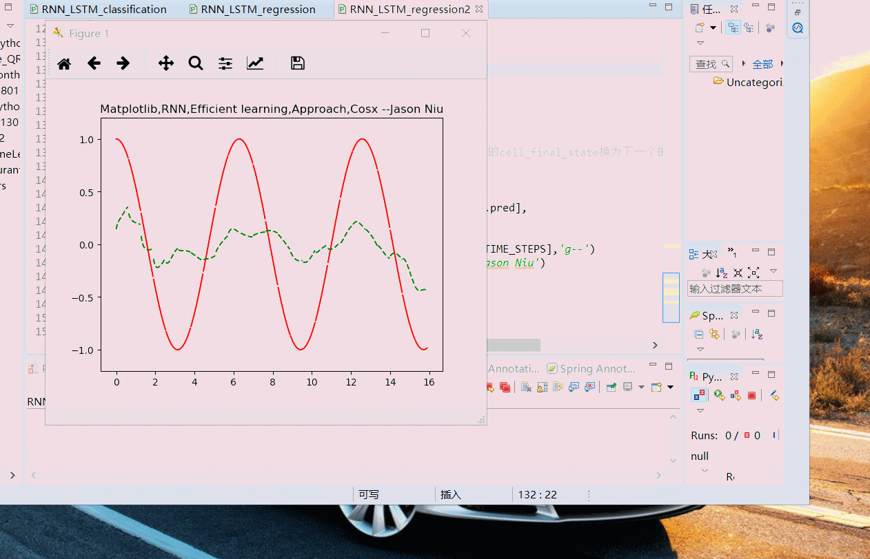 TF之LSTM:利用基于顺序的LSTM回归算法对DIY数据集sin曲线(蓝虚)预测cos(红实)(matplotlib动态演示)