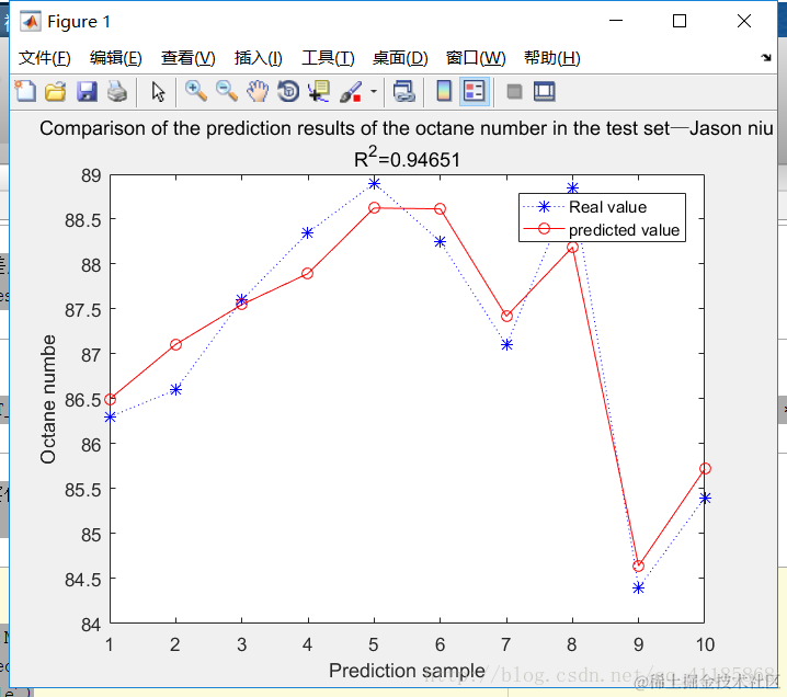 string = {'Comparison of the prediction results of the octane number in the test set—Jason niu';['R^2=' num2str(R2)]};