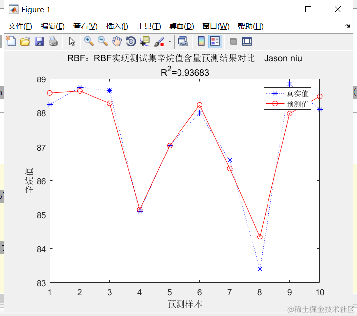 string = {'RBF:RBF实现测试集辛烷值含量预测结果对比—Jason niu';['R^2=' num2str(R2)]};