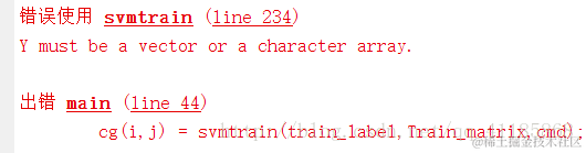 在写关于SVM时,调用svmtrain 函数,出现错误:错误使用 svmtrain (line 234) Y must be a vector or a character array. 出错 main (line 44) cg(i,j) = svmtrain(train_label,Train_matrix,cmd);
